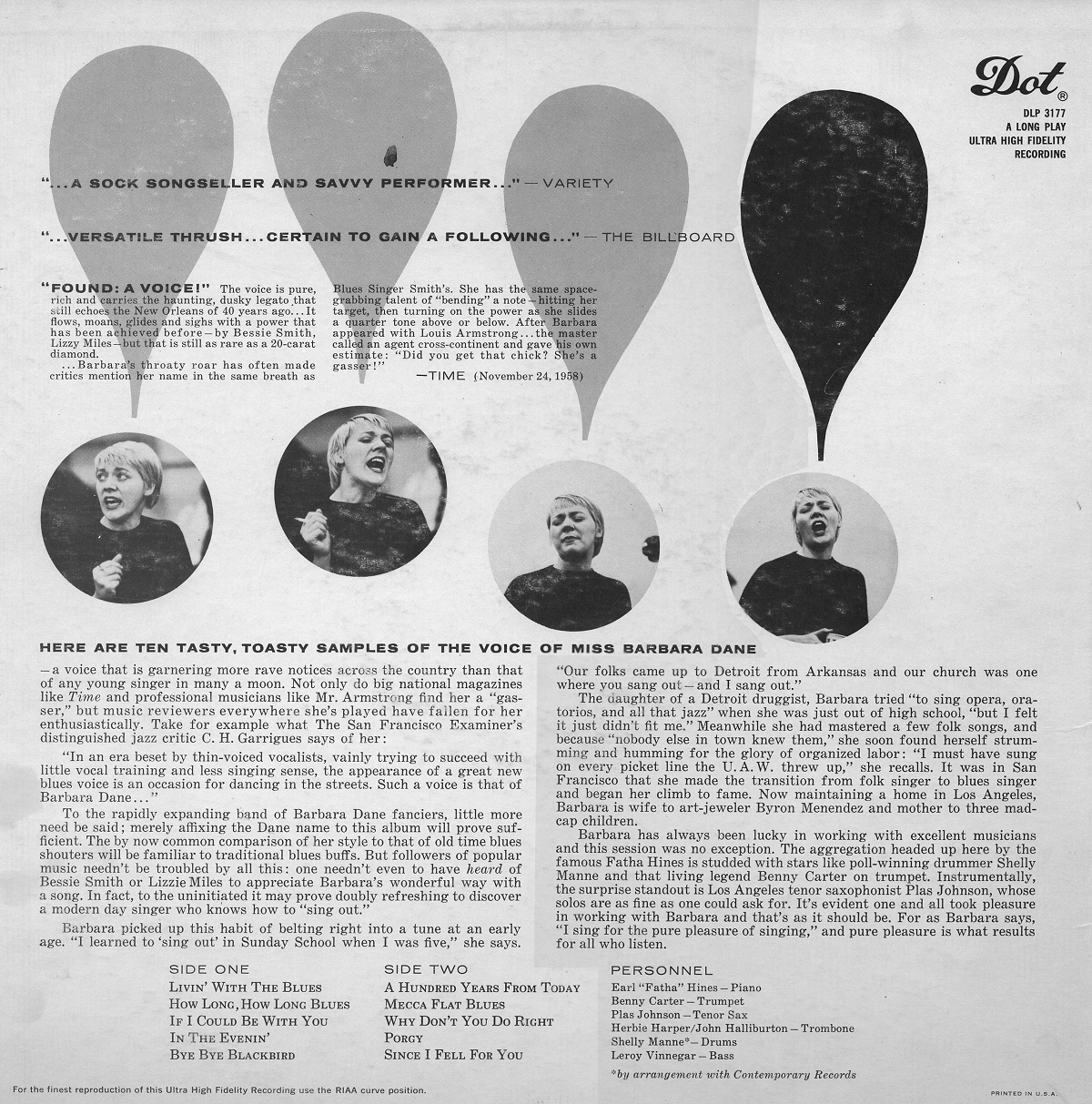 Le deuxième album de Barbara Dane ; " Livin' With The Blues " est édité en Amérique sur le label Dot Records DLP-3177 ( Mono ) / DLP 25177 / DLP 25,177 ( Stereo ) [ US ] en 1959 . Un bel album de Jazz teinté de Blues , d'une grande dame , en bref du Blues Jazz , avec de très bons titres comme " Mecca Flat Blues " ou encore " Why Don't You Do Right " et " How Long , How Long Blues " sans oublier bien sur , le titre de l'album " Livin' With The Blues " pour ne citer qu'eux .